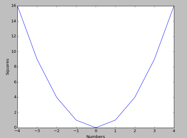 >>> plt.plot([-4,-3,-2,-1,0,1,2,3,4],[16,9,4,1,0,1,4,9,16]) >>> plt.ylabel('Squares') >>> plt.xlabel('Numbers') >>> plt.show() |