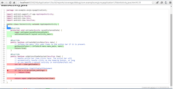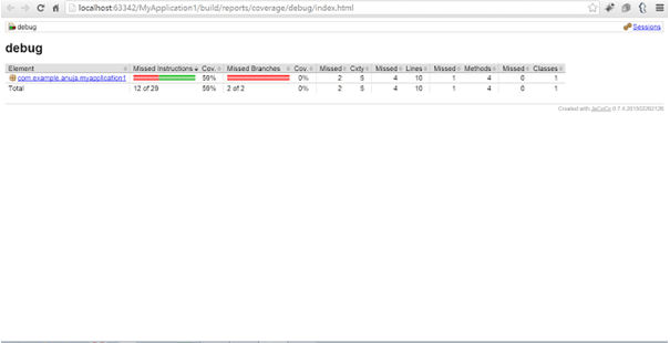 testInstrumentationRunner "com.example.anuja.myapplication1.AndroidJacocoTestRunner" also add code given below in buidTypes. debug { testCoverageEnabled = rue } |